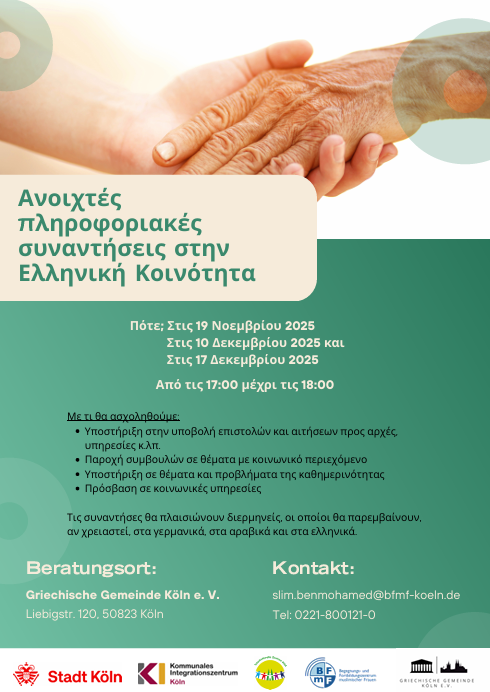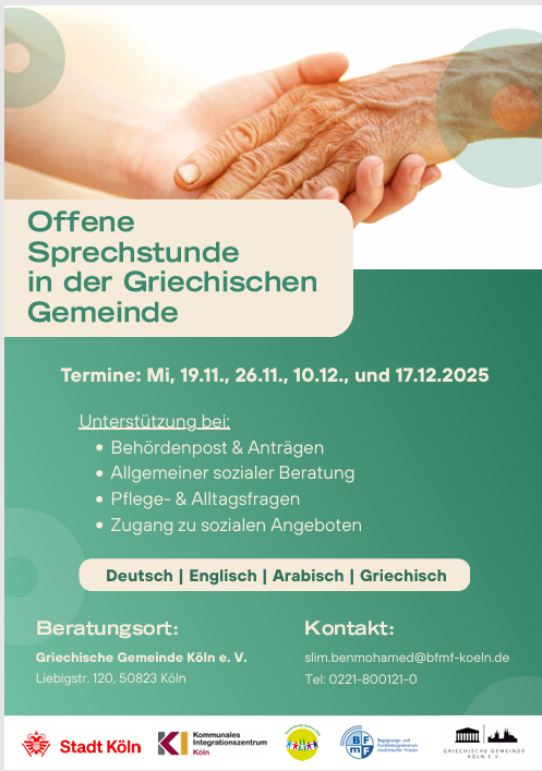 Seniorennetzwerk der Griechischen Gemeinde Köln in Kooperation mit der Seniorenberatung BFmF e.V. Veröffentlicht am 12. November 2025 von Vissarion Offene Sprechstunde in der Griechischen Gemeinde_GR (00000002)
