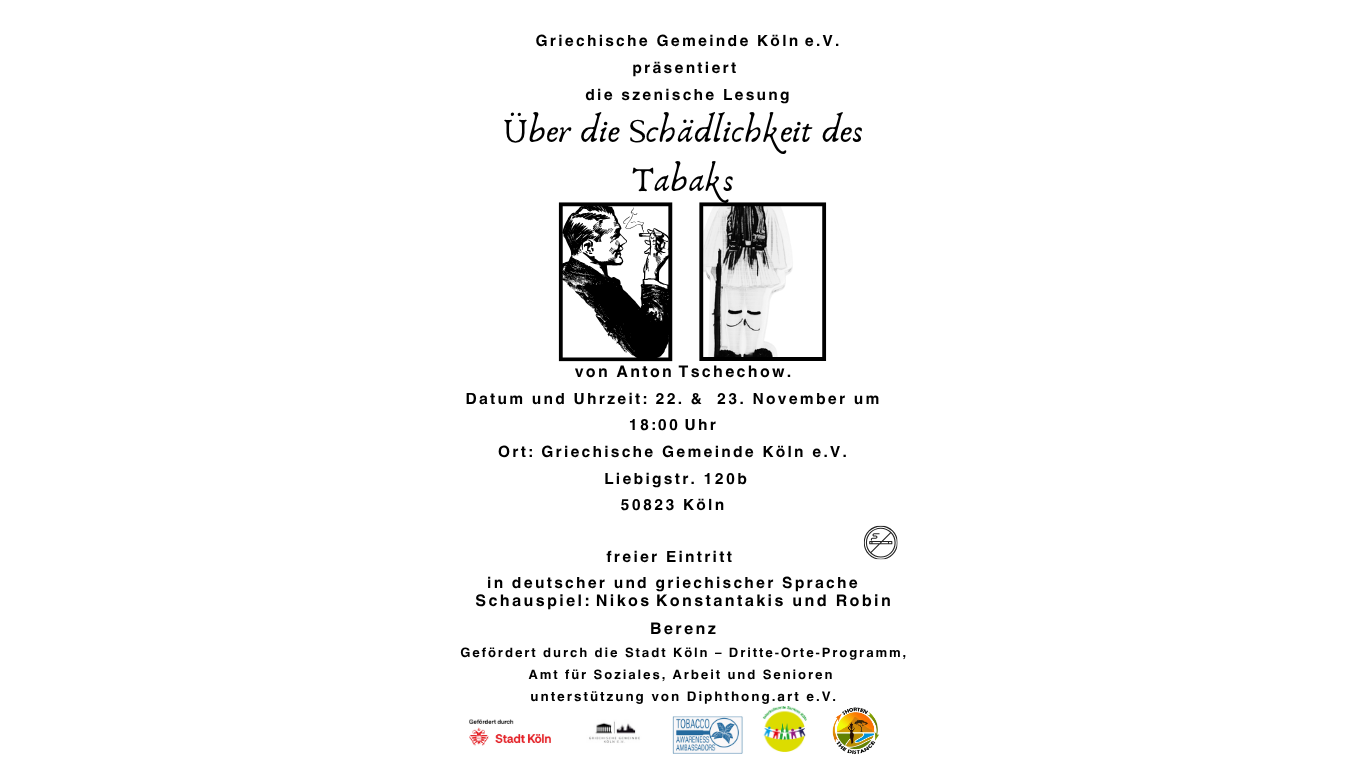 Die Szenische Lesung wird veranstaltet im Rahmen der “Dritten Orte“, ein Projekt der Stadt Köln, das in diesem Jahr mit dem Motto “Lieber mit Niko statt Nikotin” von der Griechischen Gemeinde Köln umgesetzt wird.